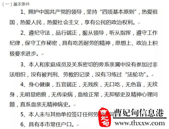男性,年龄在18至30周岁(1985年1月1日以后出生),身高在1.70米以上,具有国家承认的大专及以上学历,部队退伍军人可放宽到高中学历。