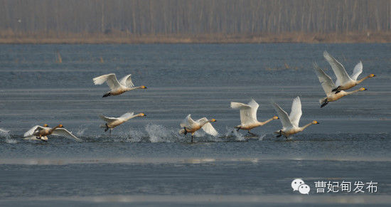 每到3月初,北迁的大天鹅将这里作为一处歇脚地。气温略有回升,在阳光的照射下显得格外亮眼。放眼望去,在水面上出现了许多的“小白球”,我们把镜头拉近观察,果不其然,大约有38只天鹅在这里栖息,有的在梳理白瓷般的羽毛,有的好似埋头冥想,有的闲庭信步……他们悠然自得的姿态,闲雅胜似仙子的神情令人赞叹不已。几十只天鹅在距离不足百米的湖面上漫游,犹如点点白帆荡来荡去。清脆的鸣叫不绝于耳,他们时而曲颈温情相依,如情侣在喃喃私语;时而引吭挥翅拍击水面,似狂歌劲舞,如诗画般的自然之美呈现出来。在曹妃甸湿地形成了一个天然的天鹅湖。