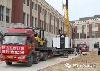 搬迁施工队正在吊卸先进的数控中心实训设备。(孔祥华 摄)
